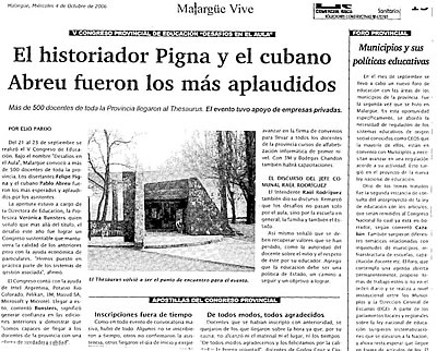 Nuestro columnista, el profesor cubano Pablo Abreu, junto al historiador argentino Felipe Pigna, los dos expositores más apaludidos en el V Congreso Provincial de Educación realizado en Malargüe.