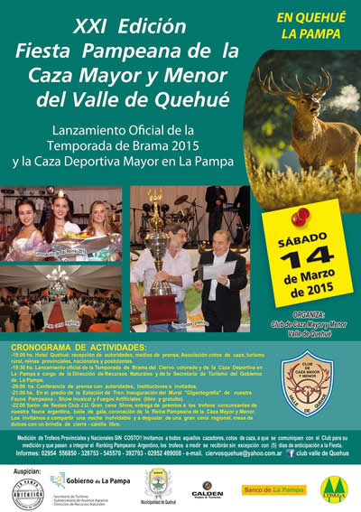 La 21ª Edición de la tradicional “Fiesta Pampeana de la Caza Mayor” que anualmente desarrolla el Club de Caza Mayor y Menor Valle de Quehué, será escenario una vez más, del lanzamiento oficial de la Temporada de Avistaje de Ciervos en Brama en la Reserva Provincial Parque Luro y la Apertura de la Caza Deportiva Mayor en La Pampa.