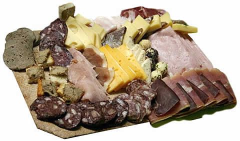 Primer Plato: tabla de fiambres con queso, terrines, panceta casera, chorizo de jabalí, chorizo de ciervo, jamón crudo de cerdo, lomito de jabalí, morcilla blanca, morcilla negra, queso de cerdo casero.