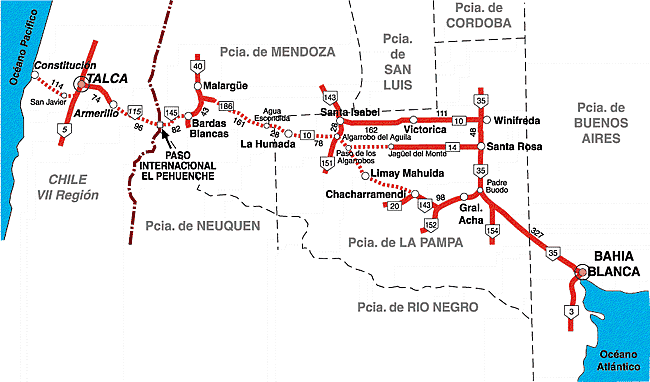 Among the corridors, there are two well defined: one will link Constitución, a Chilean port area located in VII Región del Maule to the port of San Nicolás de los Arroyos in Buenos Aires Province, and it crosses the center and south of Mendoza Province, the south of San Luis Province, the north of La Pampa Province and important locations in the north of Buenos Aires Province such as Junín, Pergamino, etc. The other will link the same port area in Chile to the port of Bahía Blanca, in Buenos Aires Province, by crossing the south of Mendoza Province, La Pampa Province from northwest to southeast, and the south of Buenos Aires Province. In both routes, there are portions of road that need improving, while others are not paved at all.