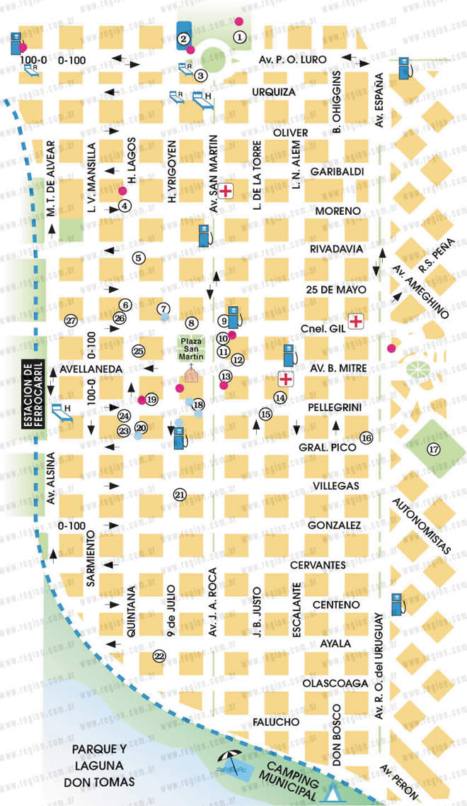 5 Correo Argentino 7 Banco Galicia 8 Universidad Nacional de La Pampa 9 Automóvil Club Argentino 10 Banco Hipotecario Nacional 11 Municipalidad 12 Archivo Histórico 13 Banco de la Nación Argentina 14 Jefatura Policía de La Pampa 15 Delegación Policía Federal