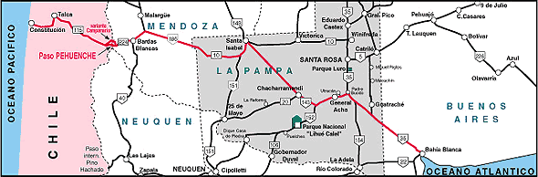 ![]() A partir de la pavimentación del paso "El Pehuenche", su circulación permitirá establecer varios Corredores Bioceánicos que conecten el Pacífico con el Atlántico, mejorando el intercambio comercial y turístico entre ambos países y favoreciendo la exportación entre el sudeste asiático y los países del Mercosur. Entre los corredores previstos, el que une los puertos de Constitución en Chile y Bahía Blanca en Argentina, se presenta como el mejor visto por las consultoras internacionales. Este Corredor que mencionamos, atravesaría el Oeste de La Pampa, pasando por la ciudad de General Acha, sede este año del "IV Encuentro Internacional". |