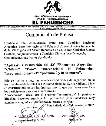 del Paso Internacional El Pehuenche, que en su comunicación