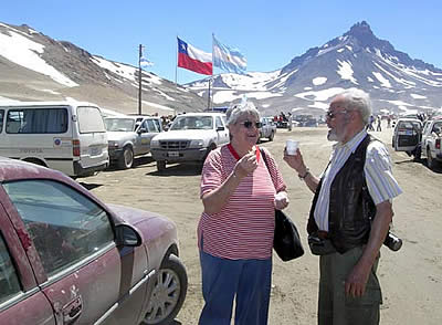 La foto obligada del viaje: Al pie del Cerro Campanario en el hito El Pehuenche. En este caso y dada la circunstancia, con vino chileno y empanadas. Fue durante nuestro cruce en automóvil durante el 46º Encuentro Binacional (ver REGION® 743).