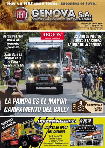 Está en circulación un nuevo suplemento color editado por REGION® Empresa Periodística, sobre el “Rally Dakar Argentina-Chile-Perú 2012”. Se trata de una revista super tamaño, en color, impresa en papel ilustración, con el listado completo de todos los pilotos, un mapa del recorrido de la carrera en sus etapas 1ª y 2ª en la provincia de La Pampa y detalles de circulación y plano de recorrido de los competidores en su ingreso y egreso a Santa Rosa, sede del 1er y más grande Campamento de toda la carrera, en los tres países por donde pasará.
