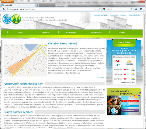 La CPE de Santa Rosa presentó en rueda de prensa, el nuevo sitio de la entidad en internet. En esta primera etapa, a través de este sitio, los interesados en tener el servicio de televisión por cable podrán inscribirse en una lista de espera a partir de la cual se iniciará en breve la conexión a CPEtv. El sitio es www.cpe.com.ar