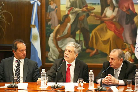 El gobernador Scioli, el ministro Julio de Vido y el gobernador Jorge, cuando firmaron el convenio para la posible construcción de obras en las Rutas Provinciales 1 y 4 en nuestra Provincia y las Rutas 70 y 65 en Buenos Aires.