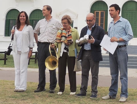 De izquierda a derecha: Mercedes Nougués, bisnieta de Luro; Oscar Folmer, coordinador del Parque; Mercedes Arana Luro, nieta de Pedro Luro; Marcelo Nougués, bisnieto de Luro y el secretario de Turismo de La Pampa, Santiago Amsé, frente al edificio hoy declarado Monumento Histórico Nacional “Museo El Castillo”, en perfecto estado de conservación -considerando que el mismo ya tiene más de un siglo- en el cual se realizan visitas guiadas todo el año y en su escalinata se han desarrollado importantes espectáculos culturales de gran nivel, siempre gratuitos.