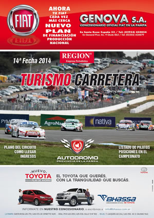 Además como siempre, otra producción de REGION® Empresa Periodística ya está en circulación, es la Revista de la 14ta Fecha del Campeonato Argentino 2014 de TC y TC Pista, que se disputa este fin de semana, en super tamaño, a todo color, impresa en papel ilustración, con el listado completo de todos los pilotos, los horarios estimados de las clasificaciones, series y finales, y las posiciones actuales del campeonato.