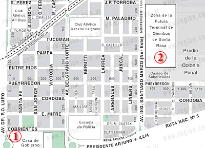 El lugar previsto para la futura Terminal de Omnibus de Santa Rosa es sobre la Avenida de Circunvalación, al lado del actual Casino de Suboficiales de la Colonia Penal. La superficie total del terreno solicitado a Nación es de 80 mil metros cuadrados -unas seis veces del espacio actual-. Son 400 metros de frente (desde Entre Ríos hasta Torroba), por 200 metros de profundidad. El diseño del proyecto será por Concurso, que sería convocado -según dijo el intendente Alcala-, por el Consejo Profesional de Ingeniería y Arquitectura de La Pampa.
