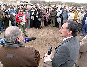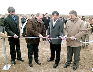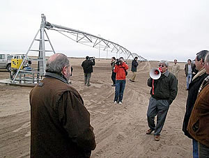 El gobernador de la Provincia encabezó la puesta en marcha del nuevo proyecto agroindustrial de la firma «Zille SRL» en Colonia Chica, La Pampa, correspondiente a la sistematización de tierras antes improductivas y a la colocación de cuatro modernos equipos «T-L» norteamericanos de riego presurizado. La inauguración de la estación de bombeo y puesta en marcha de los equipos, corresponde a la primer etapa de una superficie total de 1.500 hectáreas adjudicadas por el EPRC.