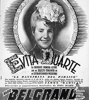 Afiche: Un anuncio publicitario de Radio Belgrano de Buenos Aires, promoviendo programas sobre la vida de mujeres famosas. En 1934 Evita llegó a Buenos Aires con el sueño de convertirse en actriz. Después de años de trabajo duro, su sueño se hizo realidad. Ella apareció en la tapa de varias revistas, trabajó en programas de radio, actuó en teatros, películas, y publicidad. La experiencia de Evita en la radio, se supone que le dio pericia en su comunicación con la gente.