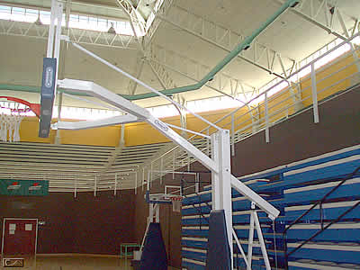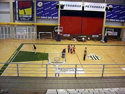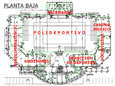 En planta baja estará el campo de juego polideportivo, frente el escenario fijo fuera del campo de juego, permitirá instalar un escenario móvil desmontable que avanzará sobre el polideportivo y a su vez las dependencias necesarias como vestuarios y accesos comunes.
