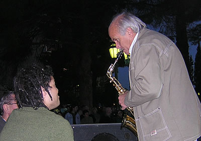 El intendente Alcala de Santa Rosa, practicando saxo, junto a uno de los músicos de «Yergue la Oreja». Fue en la Plaza San Martín durante la última jornada del «Hecho por Jóvenes».
