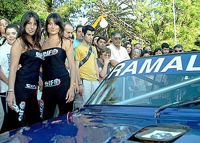 Juan María Traverso visitó la ciudad de General Pico auspiciado por la firma local «El Surco Tractores», promocionando la marca de lubricantes «Elf». Muchos seguidores se acercaron a solicitar un autógrafo al ídolo del automovilismo, que estuvo siempre acompañado por las tres «máquinas» que vemos en la foto: el Torino y las dos bellezas que llevaron los relojes a más 7.000 rpm. |