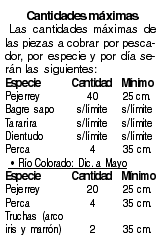Se permitirá la captura de mojarras: Cheirodon sp., Jenynsia sp., Cnesterodon sp., y camarones Paleomonetes sp., con medio mundo, con la finalidad de ser empleado como carnada natural para la pesca deportiva y la pesca de carpa común (Cyprinuscarpio) durante todo el año en los ambientes acuáticos de la provincia (a excepción de las zonas vedadas en el Río Colorado), sin límite de cantidad ni longitud.