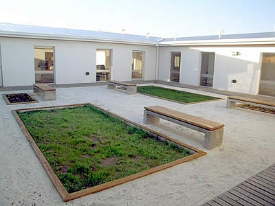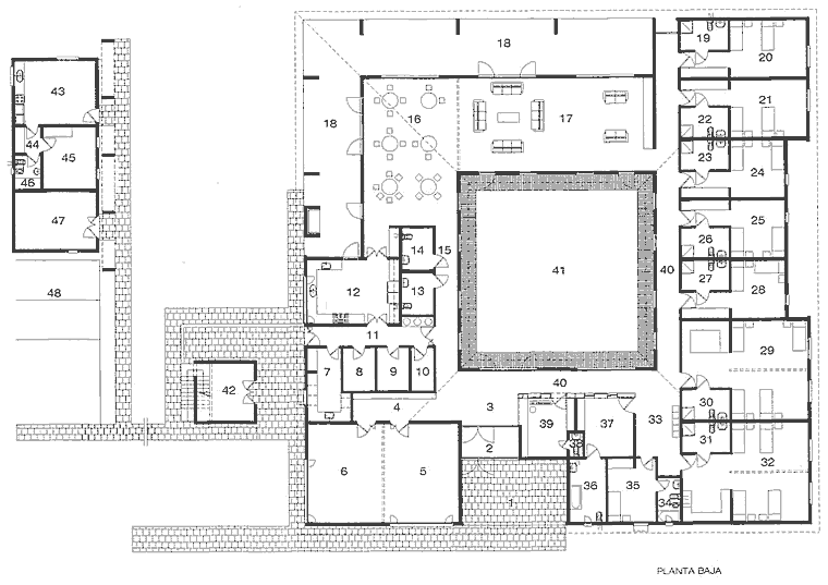 7- Las zonas de circulación: De cómodas dimensiones y siempre en relación con espacios exteriores que aportan luminosidad y agradable vista evitando así el oscuro y largo corredor de tantos centros asistenciales