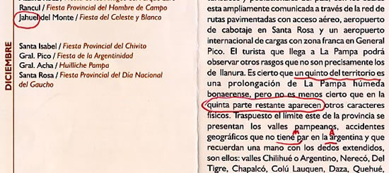 2. 1 AL ABRIR EL FOLLETO frente a Fiestas Populares bajo el título LA PAMPA, en los últimos renglones dice: «Es cierto que un quinto del territorio es una prolongación de La Pampa húmeda bonaerense, pero no es menos cierto que en la quinta parte restante...», debería expresarse: Es cierto que un quinto del territorio es una prolongación de la pampa húmeda bonaerense pero no es menos cierto que en las cuatro quintas partes restantes...