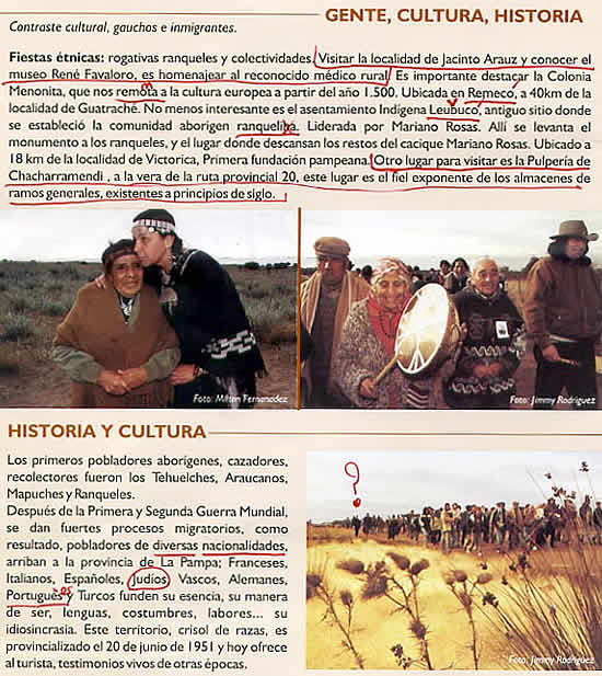4. 2 EN EL PRIMER DESPLIEGUE bajo el título LA PAMPA AUTENTICA, bajo subtítulo en negrita Fiestas étnicas, se mezclan las rogativas ranqueles y colectividades, con visitar la localidad de Jacinto Aráuz y con la ubicación de la Colonia Menonita; luego se nombra Leuvucó y más tarde la Pulpería de Chacharramendi.