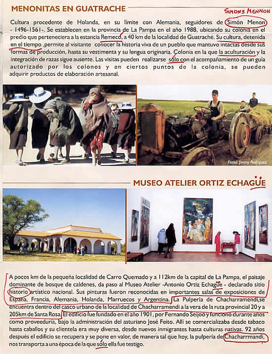 9. 2 EN EL PRIMER DESPLIEGUE bajo el título LA PAMPA AUTENTICA, bajo el subtítulo MENONITAS EN GUATRACHE, hay frases que podrían considerarse inapropiadas. Allí se define a los Menonitas, como «Su cultura, detenida en el tiempo...» y más adelante se agrega «Colonia en la que la aculturación y la integración de razas sigue ausente».