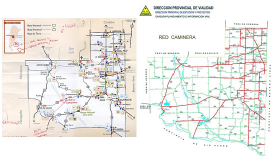 6.1 El mapa del interior del folleto, que aunque carece de identificación -NOMBRE-podemos darnos cuenta que pertenece a nuestra provincia, La Pampa; como primera medida, no se ajusta al trazado oficial de la red caminera publicada por la Dirección Provincial de Vialidad. (Se adjunta Red Caminera de la DPV actualizada a Enero 2006).