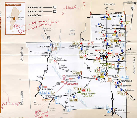 En este marco es que se proyecto realizar el esquema de un mapa turistico para la provincia de La Pampa y no un mapa catastral o rutero, siguiendo la tendencia actual en este sentido como el trabajo realizado por la Secretaria de Turismo de la Nacion o el que tiene proyectado el Ente Patagonico y que descontamos que los tecnicos de la Camara deben conocer.