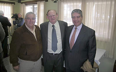 El flamante director del Centro Regional La Pampa - San Luis, del INTA, Dr. Ricardo Thornton, flanqueado en la foto por el cabañero José Arosteguy y el Dr. Pedro Alvarez Bustos, presidente y delegado ante la Unidad Ejecutora Provincial, respectivamente, de la Asociación Argentina de Criadores de Pampinta. |