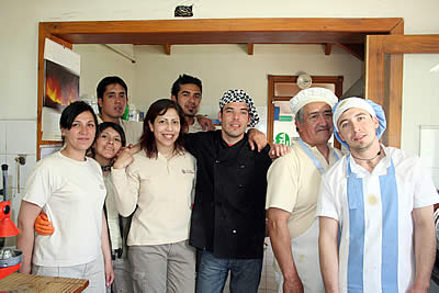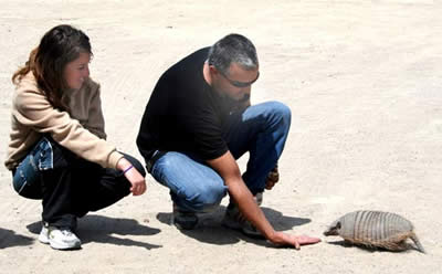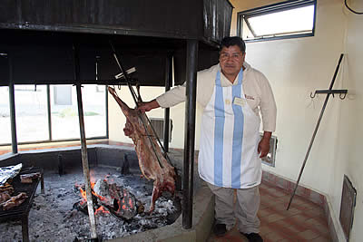 Andrea y Juan, de la Agencia de Viajes y Turismo «Abriendo Huellas», muestran la curiosidad de un simpático peludo que sin inhibiciones busca el contacto con los turistas. Abajo, Lorenzo, asador de lujo, prepara el cordero patagónico que degustamos. En Caleta cuentan también con un local de regionales.