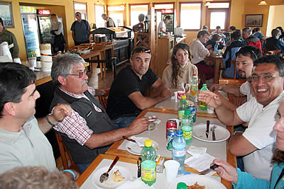 Un alto en la tarea de choferes y guías de turismo en El Parador de La Elvira. Allí una de las guías sugirió poner en el epígrafe de la foto una alusión a la fauna del lugar, lo que rápidamente fue respondido por los hombres solicitando que figure como «una reunión de machos Alfa en época de celo».