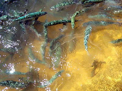 Compartimentadas, dichas jaulas albergan actualmente seis mil truchas adultas en la primera, otras seis mil en la segunda, nueve mil en una tercera y 14 mil juveniles en la cuarta.