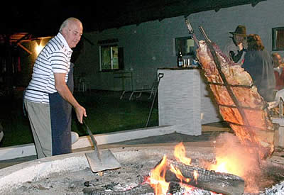 Lo disfrutamos como media hora y luego bajamos el médano, mientras nuestro guía con su linterna iba descubriendo grupos de ciervos en la espesura del caldenal, que se hacían evidentes por el brillo reflexivo de sus ojos. De regreso en el quincho, Pablo García Márquez acomodaba el fuego junto a un costillar vacuno que engullimos con placer...