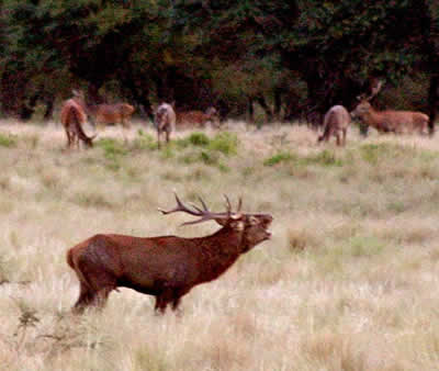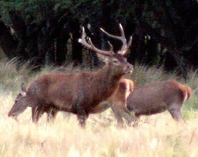Previa charla del guía y tras el reparto de binoculares, ni bien salimos, tres grupos de ciervos bien identificados cada uno con su líder, se nos presentó a gran distancia pero en una zona limpia. En un instante, habría por lo menos entre 30 y 40 animales a la vista. Unas pocas corridas de los machos para acomodar el harén de cada uno puso las cosas en orden, mientras bramaban reclamando lo suyo.