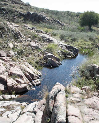 Cardos, líquenes, zampas y otras muchas expresiones de la flora, brotan bordeando un arroyito que va formando pequeños pozones de agua entre las sierras que lo encajonan.
