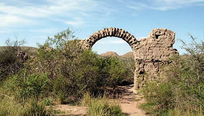 Camino al Valle de las Pinturas Rupestres, el sendero pasa por «La Casona», ruinas de la Estancia Santa María.