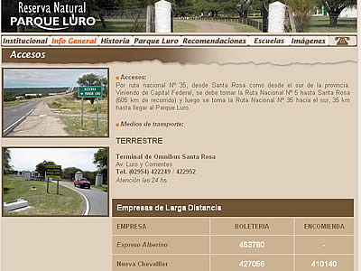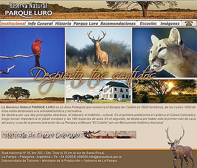 La nueva Web sobre Parque Luro: www.parqueluro.gov.ar fue diseñada por el Departamento de Diseño de la Subsecretaría de Turismo. Tiene textos sobre la misma, fotos e información para los visitantes. Fue presentada como «pensada para la utilidad y comodidad de visitantes de la Reserva» pero tiene puntos débiles en áreas importantes como la información sobre cómo llegar: figuran como transportes líneas nacionales de colectivos pero con los teléfonos de las boleterías de Santa Rosa y también el tel. del sector «encomiendas» (¿?), sin ningún dato de contacto para turistas en Bs. As. y otros puntos a quienes seguramente también está dedicada esta Web. Por otro lado, la página tiene muchos links para navegar en lugar de contar con accesos simples y directos tales como «cómo llegar», «qué hacer», «dónde alojarse», «dónde comer», etc. que podrían ahorrarle tiempo al que visita la Web y beneficiar al sector hotelero gastronómico, inexistente en esta nueva página.