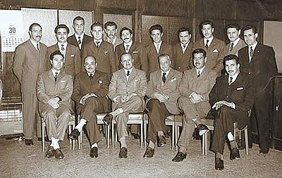 La foto de siempre, la de todos los años, pero cómo no recordarlos. Ellos fueron los primeros funcionarios y directivos del Banco de La Pampa (Sentados desde la izquierda) Vicente Guzmán, Jefe de área; Antonio Gómez, Contador; Cr. Alfredo Sierra, Presidente; Pedro Cassullo, Gerente; Ricardo Valerga, Tesorero; Américo Fernández Rojo. (De pié desde la izquierda) Juan C. Ronchi, Delfín Idiart, Lindolfo Ruggeri, Rafael Reinhardt, Esteban Vangel, Jorge Ingrassia, Domingo Vincet, Rubén Rivas, Horacio Tierno, Armando Quiroga, Noel Rodríguez.