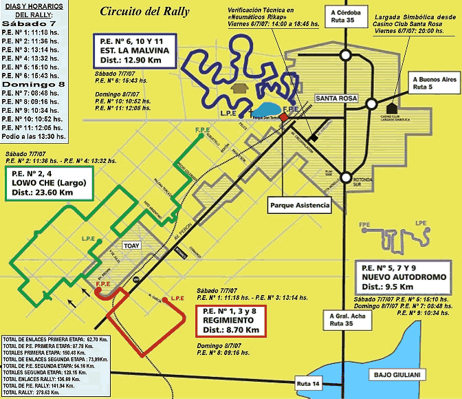 El primer auto en partir el sábado lo hará desde Toay, a las 11:18 desde el Regimiento militar, para hacer la PE1 -1ra Prueba Especial-, en tanto que el domingo la partida será a las 08:48 horas desde Santa Rosa, en terrenos del Nuevo Autódromo, estando previsto el arribo del primer auto cumplido el circuito de la Estancia La Malvina, alrededor de las 12:30 horas. El Podio con entrega de premios será a las 13:30 horas.