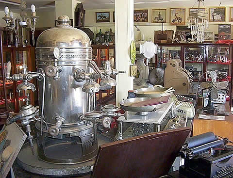 La colección es sumamente variada, donde se destaca la numismática (monedas y medallas antiguas), armas, instrumentos de música, adornos y elementos de bares y «ramos generales» antiguos, como los de esta foto. |