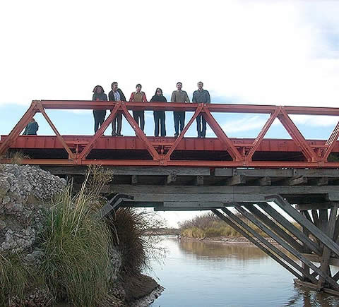 Integrantes de CaTuLPa y de Turismo, en el viejo puente «Bailey» de Santa Isabel sobre el río Salado o Chadileuvú, que desde hace 30 años sigue allí, esperando que la Provincia o la Nación lo reemplacen algún día.