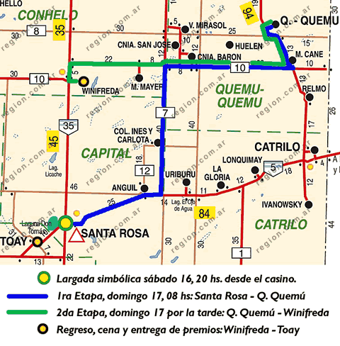 Luego de la partida simbólica del sabado 16 a la noche en el casino, la partida que cuenta es la del domingo 17 a las 8 horas desde el acceso a la RN 5 en Santa Rosa, con destino a Quemú Quemú (ver plano), donde las tripulaciones compartirán un locro para el almuerzo, con exhibición de las unidades. Luego la carrera continuará con una segunda etapa hasta la localidad de Winifreda, donde concluye. Por la noche, a las 20:30 horas del domingo, los autos serán expuestos en Toay, en donde se hará la entrega de premios y una cena con los participantes, que se calcula en unas 300 personas.