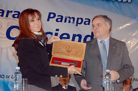 El comisionado municipal Fernández Mendía, tras declarar huésped de honor de la ciudad de Santa Rosa a la presidenta de la Nación, Cristina Fernández de Kirchner (en su primera visita a La Pampa en este cargo) y a su comitiva, le entregó una llave simbólica de la ciudad, artesanía realizada por el herrero Eduardo Elizondo.