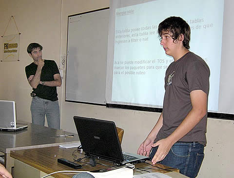 Marcos Vicente y Marcelo Rubio explicaron las ventajas de un firewall en Linux (dispositivo de seguridad para filtrar datos que ingresen de Internet a redes locales), algo que se puede hacer con cualquier PC y poco dinero; mejorando -por ejemplo- la configuración estándar que hacen los proveedores de Internet.