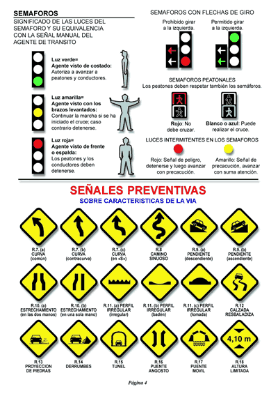 Página 4 de la Revista de Tránsito editada por REGION® Empresa Periodística con señales y cuestionario para la Licencia Unica de Conducir.