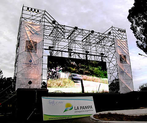 El tiempo frío e inestable no fue obstáculo para que una buena cantidad de público se diera cita el pasado lunes 11 en la Rotonda del Centro Cívico, en Santa Rosa, para observar la película del «Rally Dakar Argentina-Chile 2009», que se proyectó en los dos horarios establecidos en una organización conjunta de la Secretaría de Turismo de la Nación y la Subsecretaría respectiva de La Pampa.