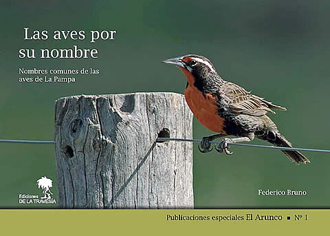 Publicaciones especiales «El Arunco» presenta su edición Nº 1, titulada «Las Aves por su nombre». Un compilado de nombres comunes de las Aves de La Pampa, un trabajo de más de 10 años en donde se reúnen 570 nombres vernáculos de casi 200 especies de aves. Como condimento adicional se incluyen datos sobre Toponimia, dichos y refranes recogidos en el territorio, creencias populares y los nombres de las aves en idioma Ranquel. Es una excelente herramienta para quienes disfrutan de la observación de aves y su estudio. Con prologo de Juan Carlos Chebez y la colaboración de numerosas y prestigiosas personas, este trabajo trae nombres olvidados o en grave peligro de extinción dentro de la cultura Argentina, casi tanto como algunas especies que se tratan en el mismo.