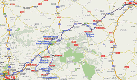 Plano sobre la base de «Google Maps», de la ruta sugerida Zaragoza-Madrid, visitando los pueblitos mencionados y los atractivos propuestos. |