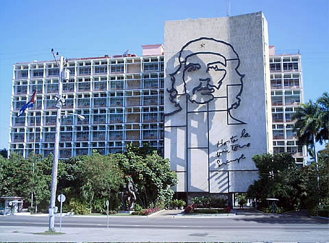 Una foto clásica de la devoción al Che Guevara. Su figura en el edificio del Ministerio del Interior, con vista a la Plaza de la Revolución José Martí.