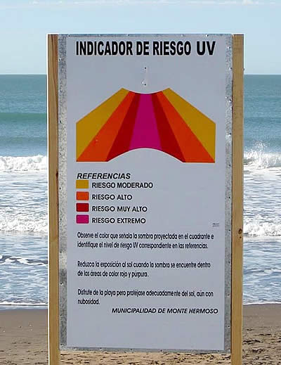 Monte Hermoso estrenó en sus playas, los 3 primeros indicadores de riesgo UV en el país. El dispositivo de bajo costo, es un instrumento de sencillo diseño que permite la interpretación hasta de los más chicos. Fue creado por el Ing. Alberto Pascucci, de Bahía Blanca, quien decidió donar los primeros indicadores que a través de una escala cromática con sus referencias respectivas permite conocer el riesgo UV en los distintos horarios para tomar las precauciones correspondientes.