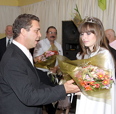 Enrique López hace entrega del ramo floral a la nueva Reina Pampeana de la Caza Mayor, Flavia Rolhaiser, en la noche del 19 de diciembre de 2009, dos semanas antes de la tragedia.