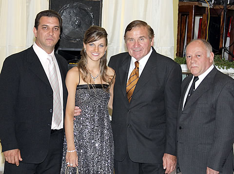 Enrique López (el primero de la izquierda), junto a la Reina de la Caza saliente, Pamela Fanfliet; el presidente del Club Valle de Quehué, Jorge Beloqui (tío de Luciano Beloqui) y el presidente de la Asociación Pampeana de Mediciones, Carlos Cavero (19/12/09). .